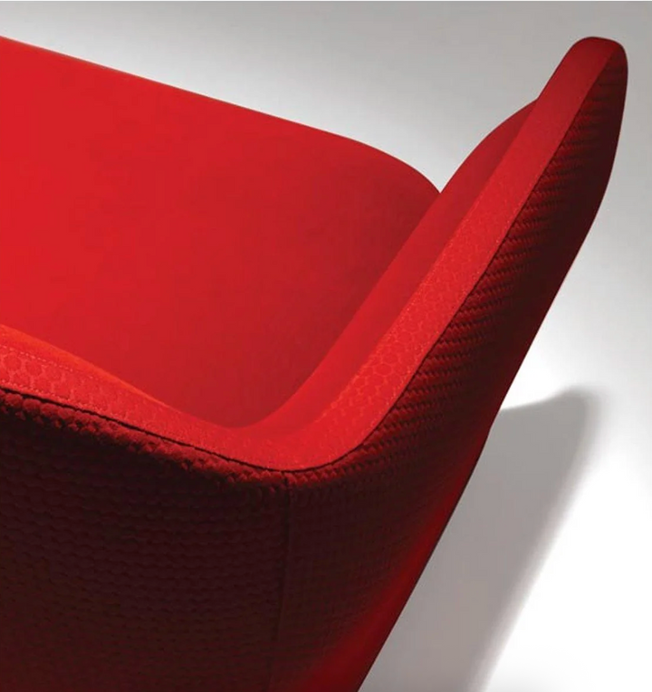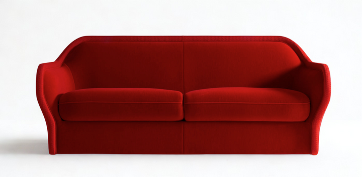 The modern luxury Bardot Loveseat featuring a bold and sculptural silhouette is upholstered in a rich, vibrant red fabric, commanding attention while still offering refined elegance. The design includes gracefully curved arms and a subtly arched back, creating a smooth and seamless visual flow.