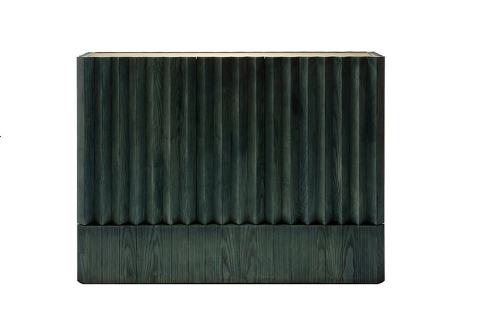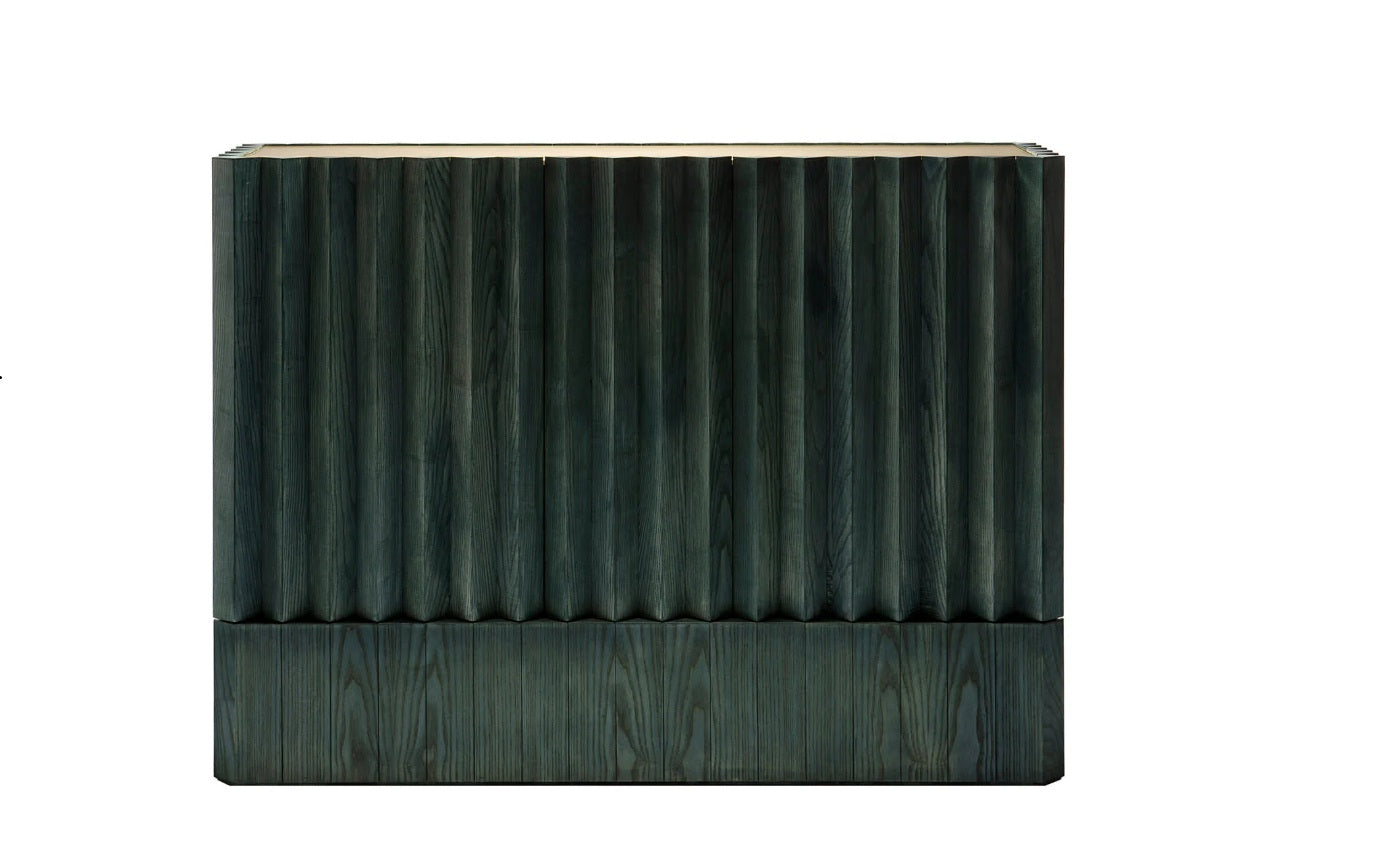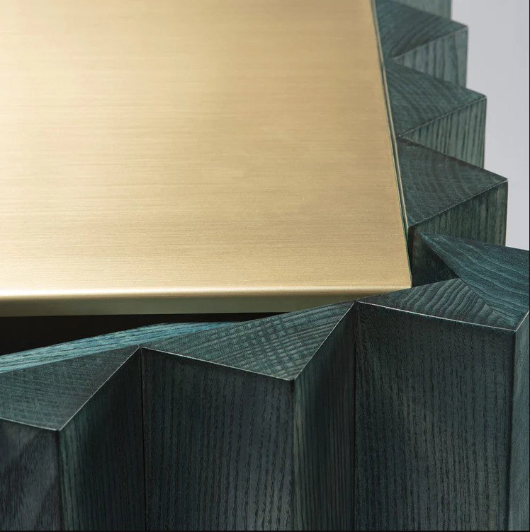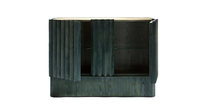 A contemporary take on traditional architecture, this cabinet will make a stately and iconic accent piece for a contemporary interior. Boasting a green shade, it is handmade of solid ash wood colored with asinine and transparent varnish on a multilayered structure with varnished interiors. It features one compartment with two doors and a 10mm extra-clear tempered glass shelf- Completed with a brushed brass top.