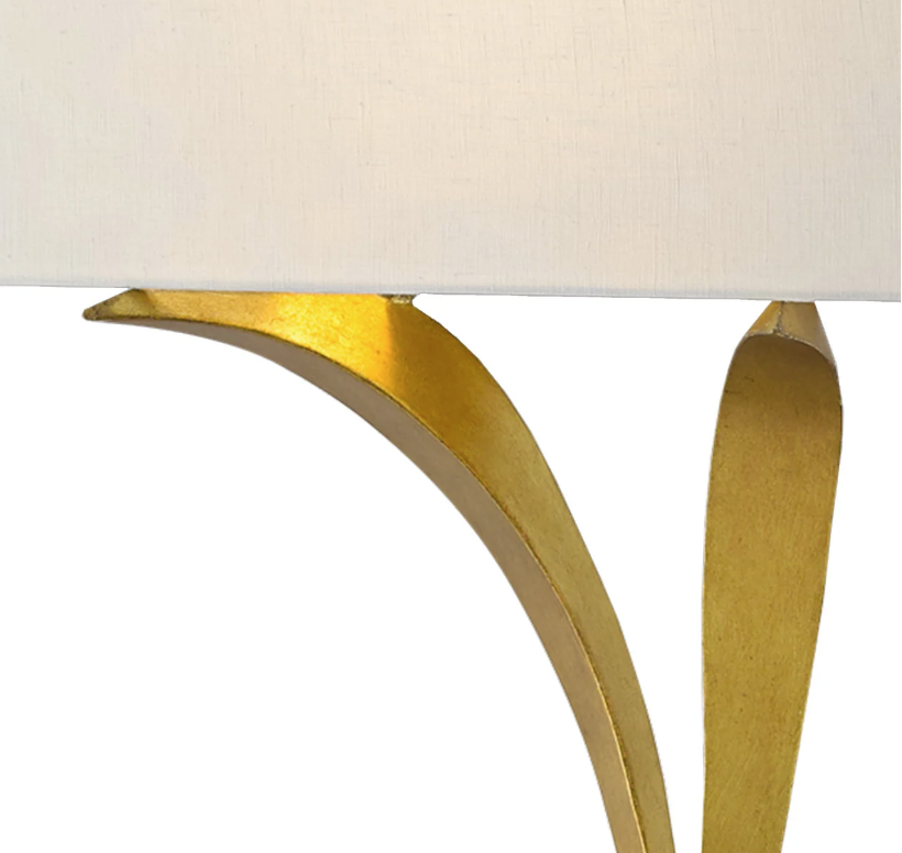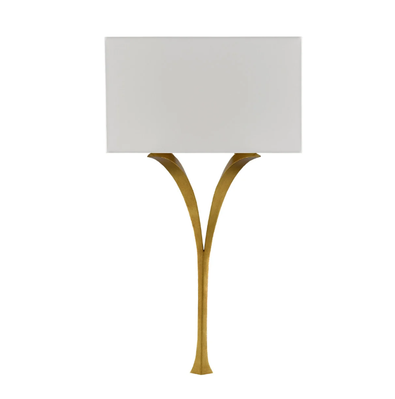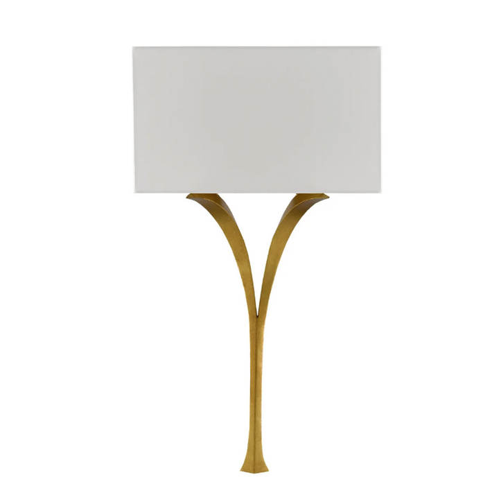 The delicately beautiful Choisy Wall Sconce is made of wrought iron in an antique gold leaf finish. The winsome curve of the wishbone shape and the slight flare at the bottom bring this gold sconce gracefulness. The sconce is fitted with a rectangular white linen shade.