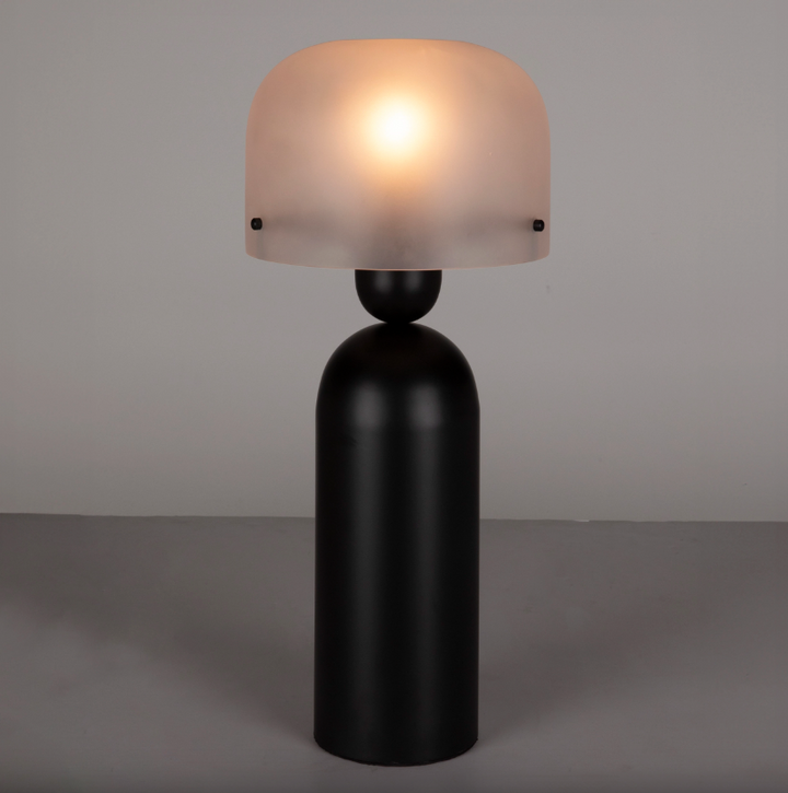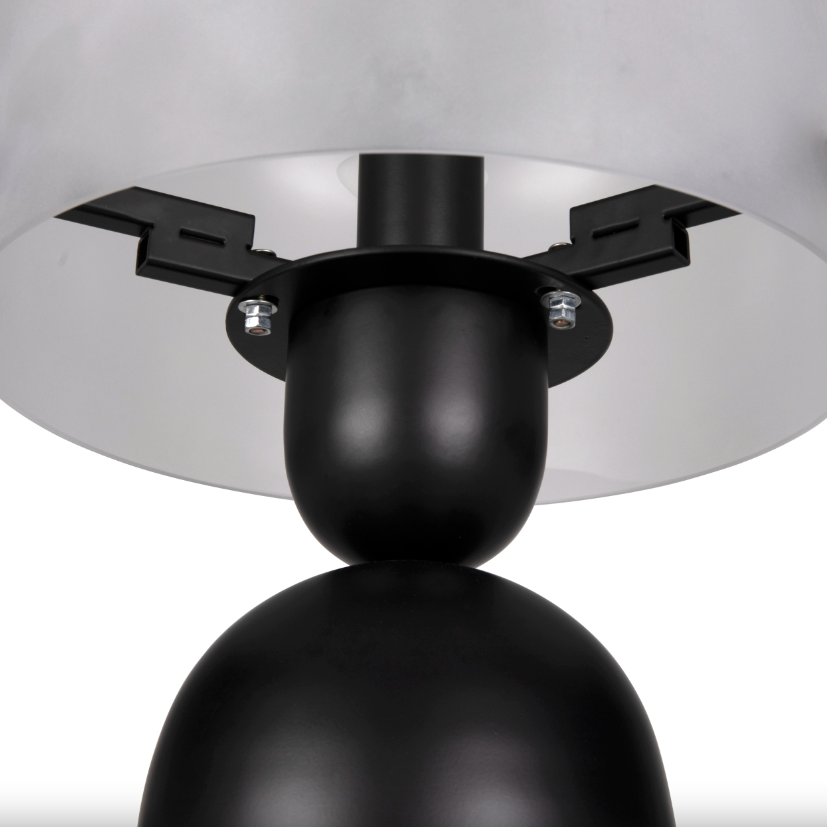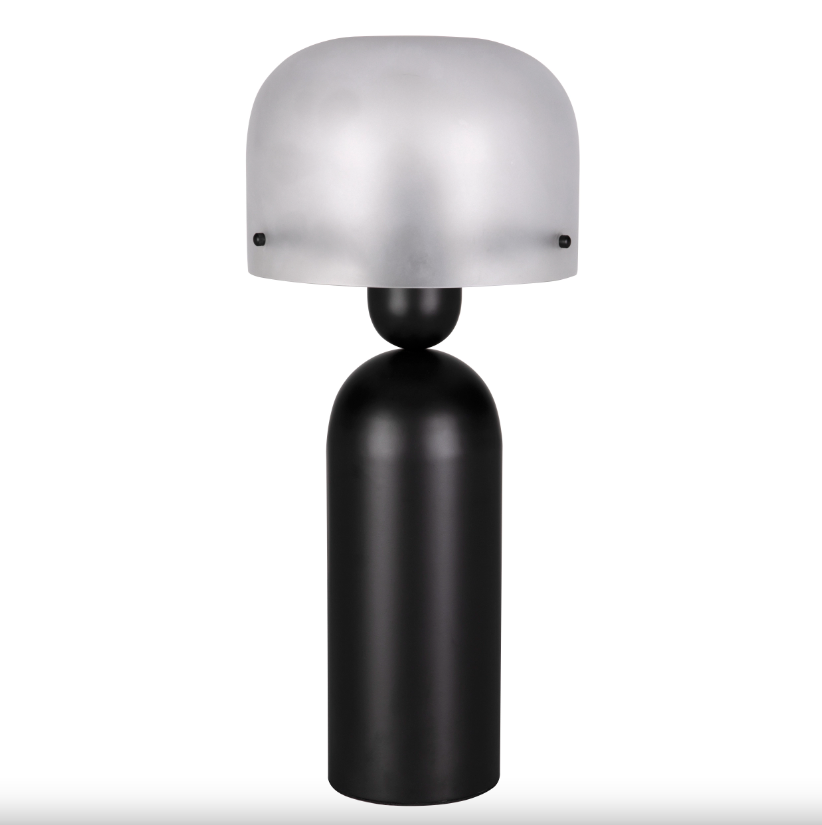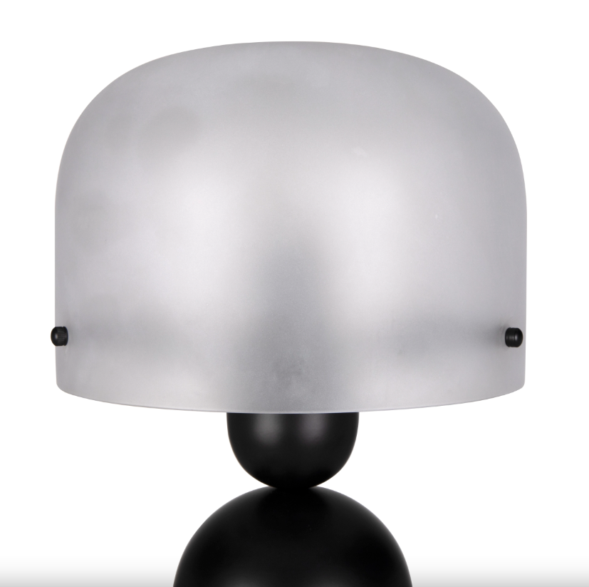 A meticulously crafted table accent that merges industrial strength with timeless elegance. The Emma Lamp's satin matte-black steel base provides a grounded, sculptural presence, beautifully contrasted by a soft, frosted-glass shade that emits a serene, ambient glow.