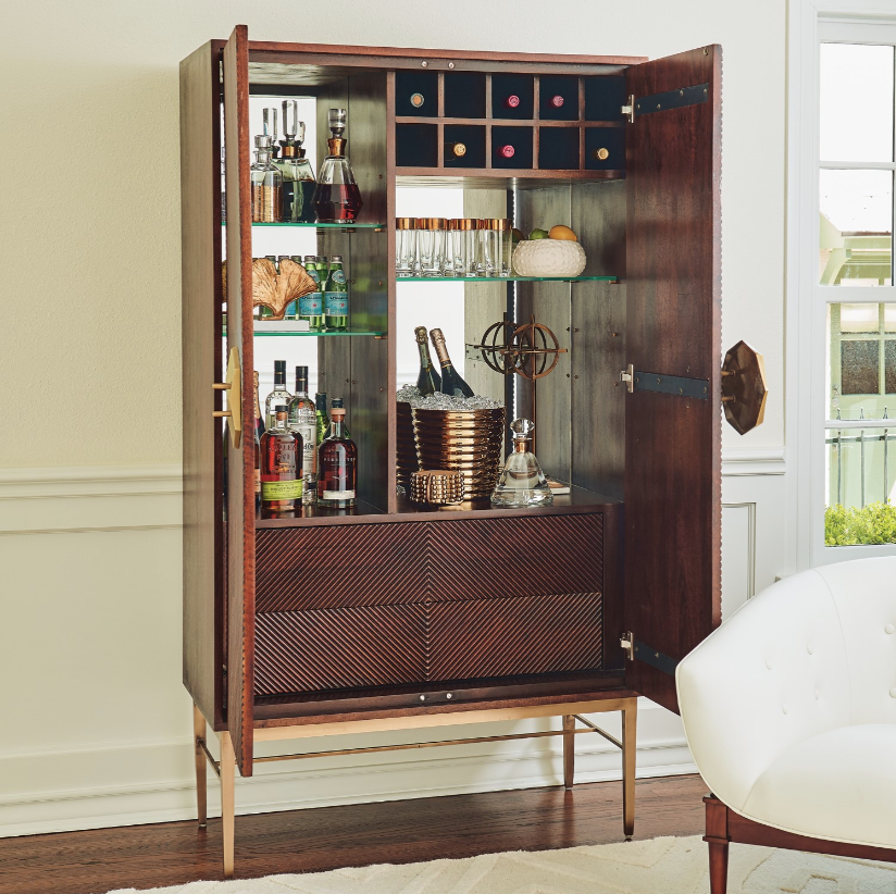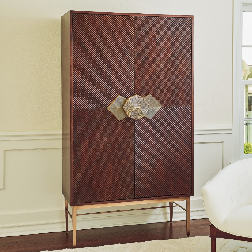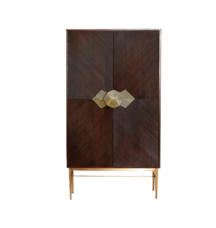 Carved dark wood set off the contrasting brass hardware inspired by the turtlebacks of the oversized species in the Galapagos island. This cabinet is both beautiful and functional with 10 bottle storage, three glass shelves, two large compartments for drink making and two full size drawers at the base.
