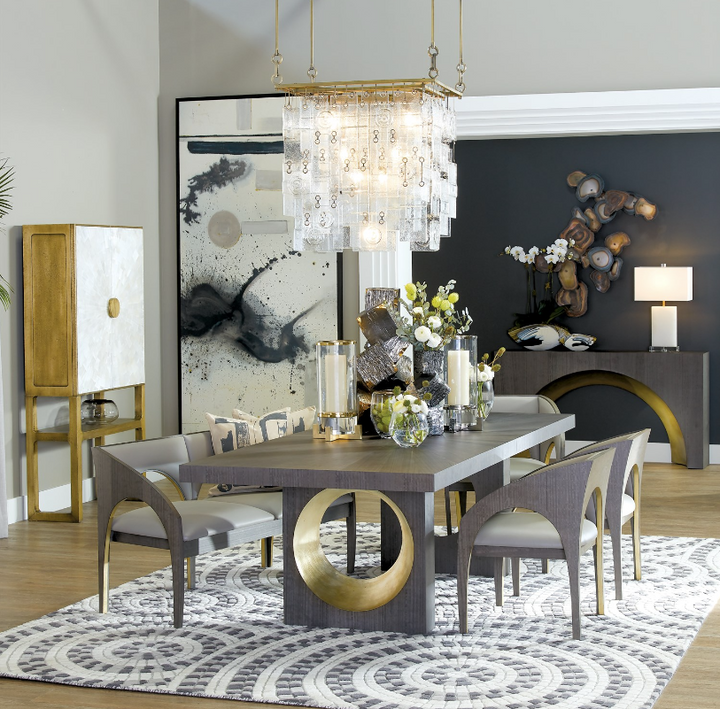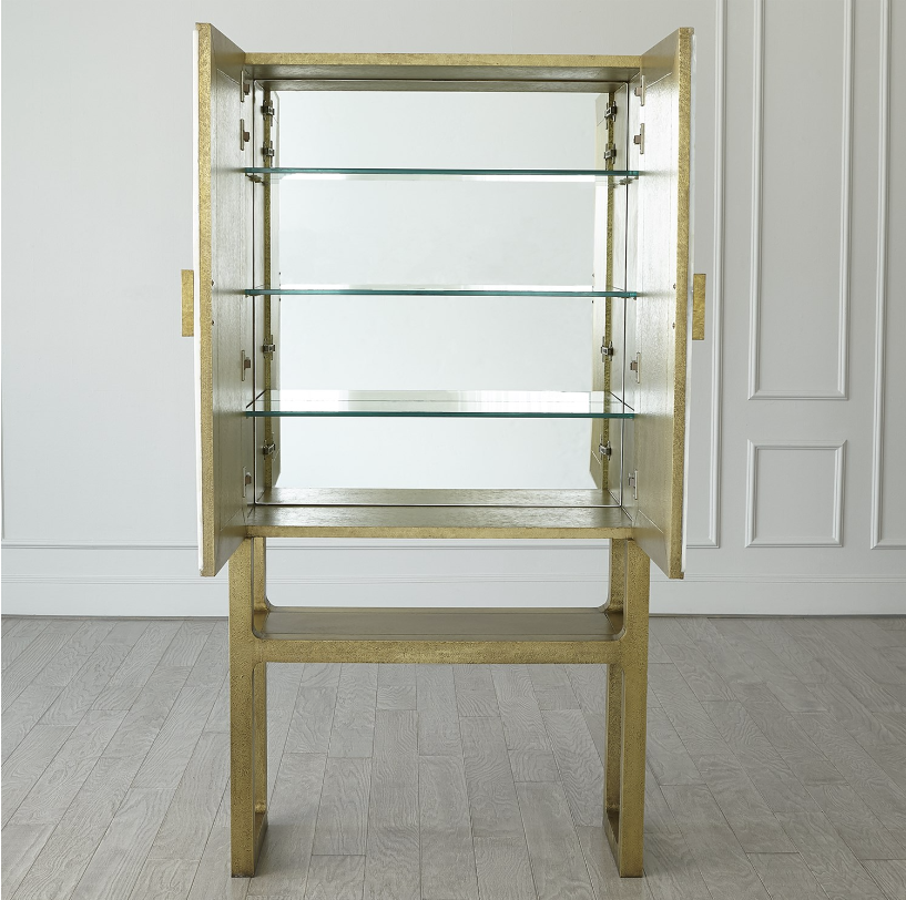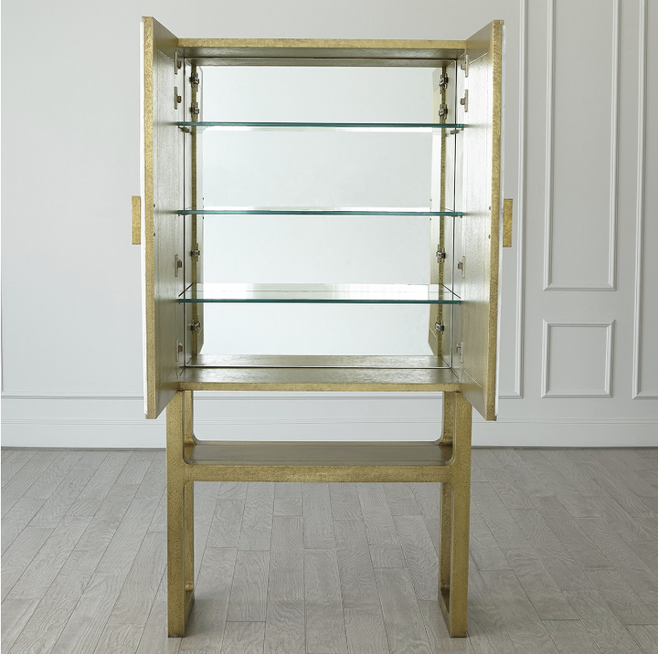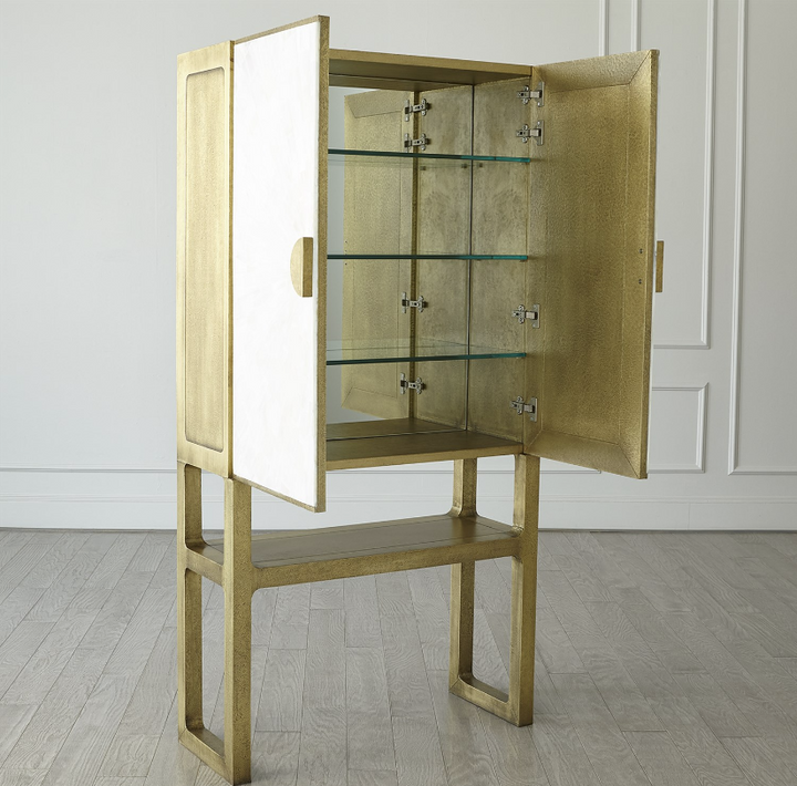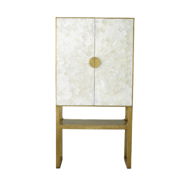 With an intricate design of selenite minerals on the front panels in a sunburst pattern, The Gypsum Bar Cabinet has a base covered in brass metal sheeting, cast aluminum hardware, adjustable European hinges, interior mirrored back and glass shelves.
