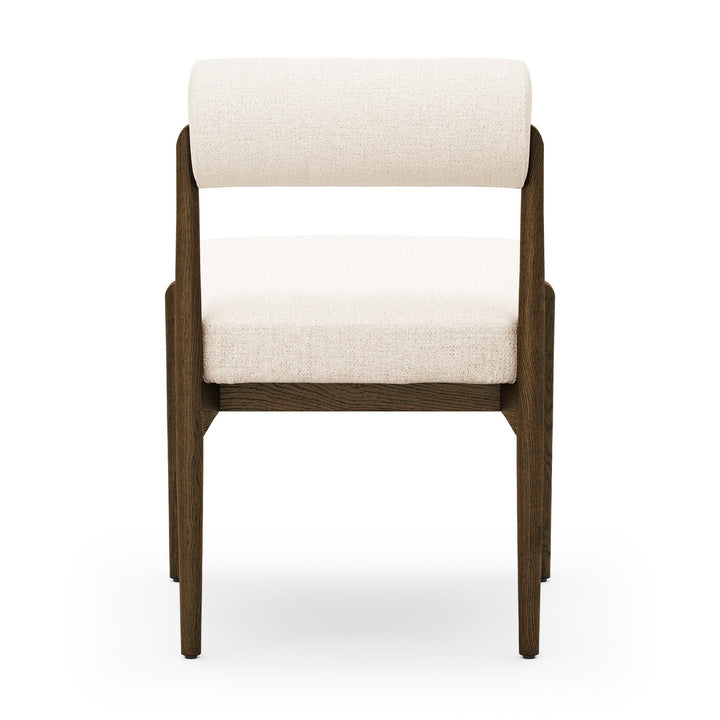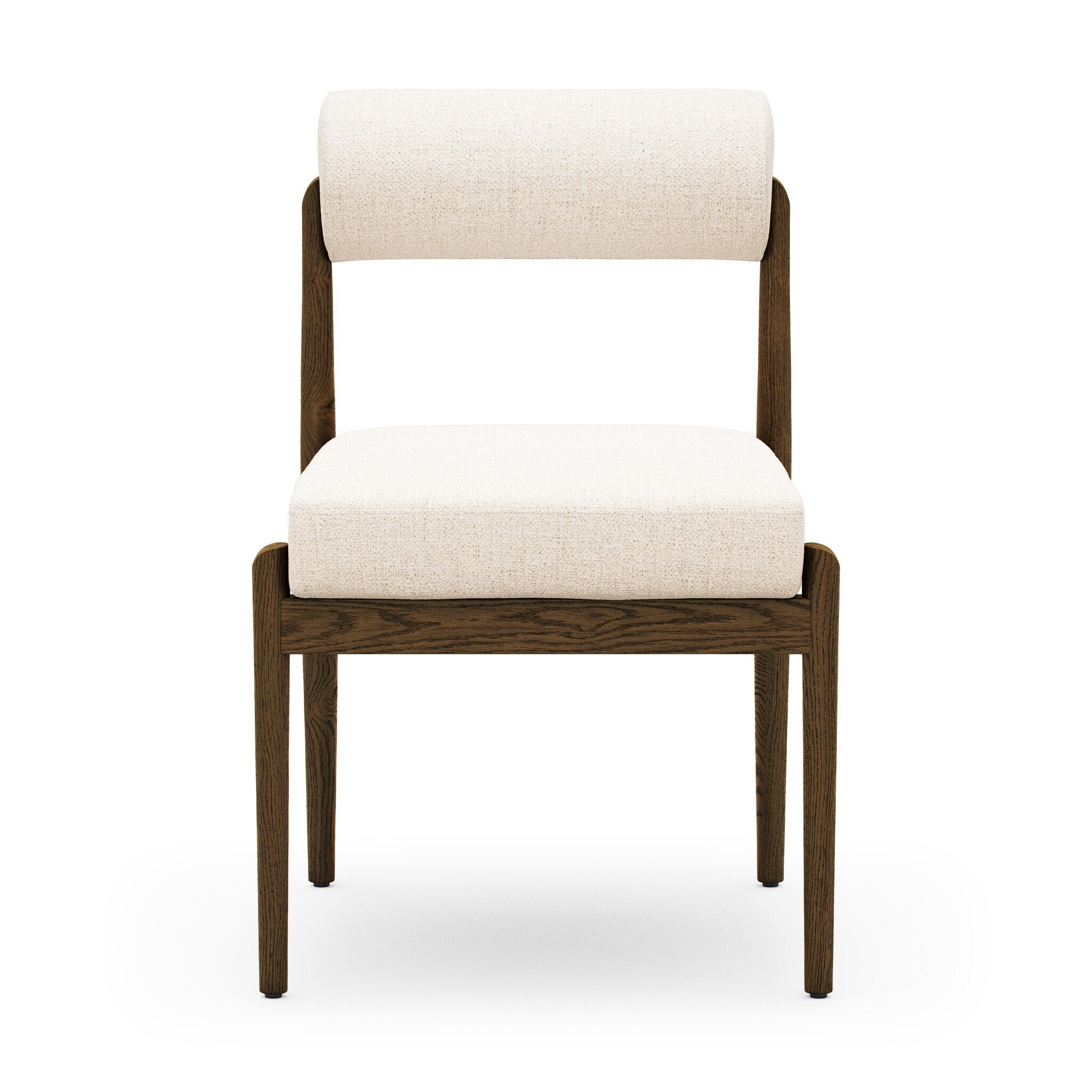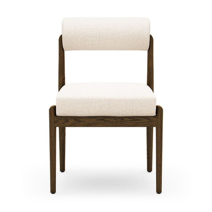 The armless dining chair is reimagined with a bolstered cylinder seat back. Framed by solid tan-finished ash.