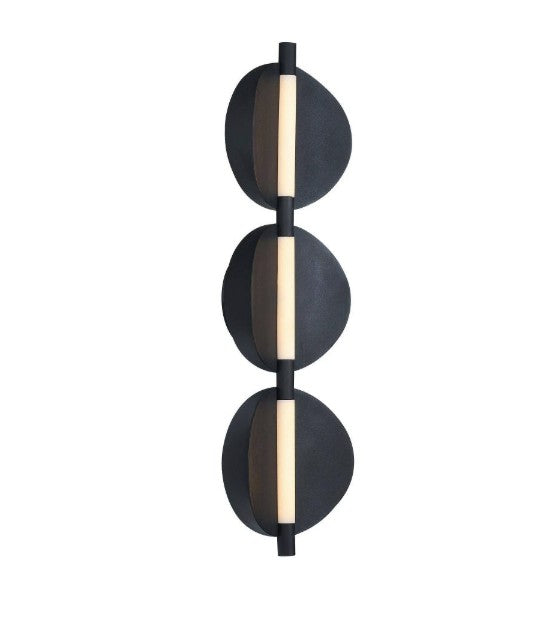 This trio of concave, bronze-plated cast aluminum medallions form a dramatic backdrop to a convex LED tube. Accented with details of opal acrylic and matte black iron, this sleek style hangs flush to the wall, making it an ideal option for a powder room or corridor. Certified for damp locations and intended for interior use. Finish will vary.