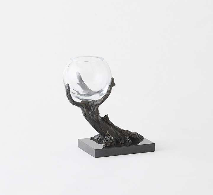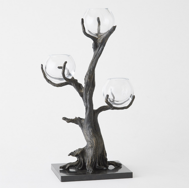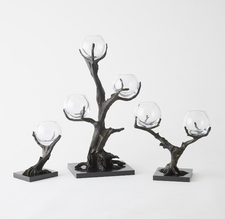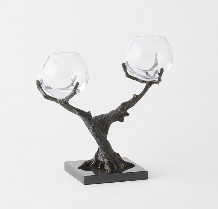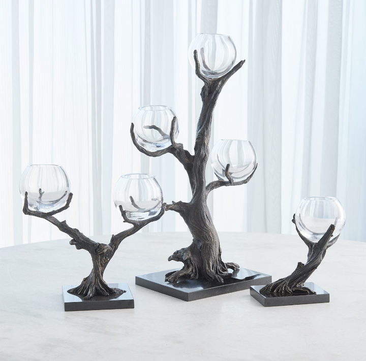Stems of solid cast iron twist and turn to form the Monterey Vase Holders, featuring a hand-painted bronze finish on black marble bases. These artful holders combine natural elements with refined craftsmanship, creating elegant accessories for any space. The clear glass vases beautifully showcase small blooms.