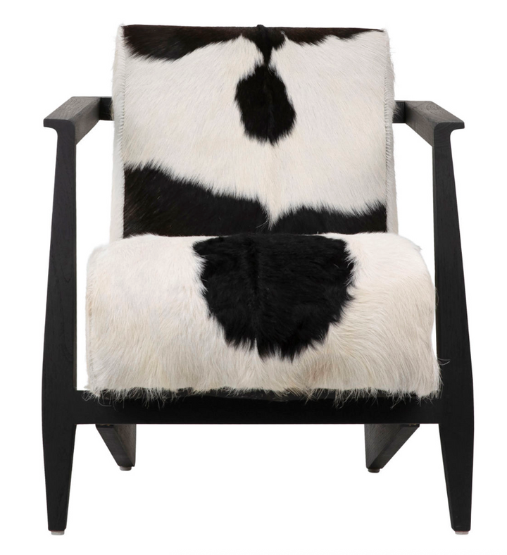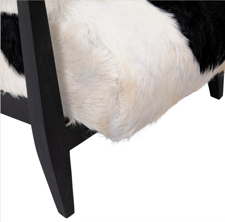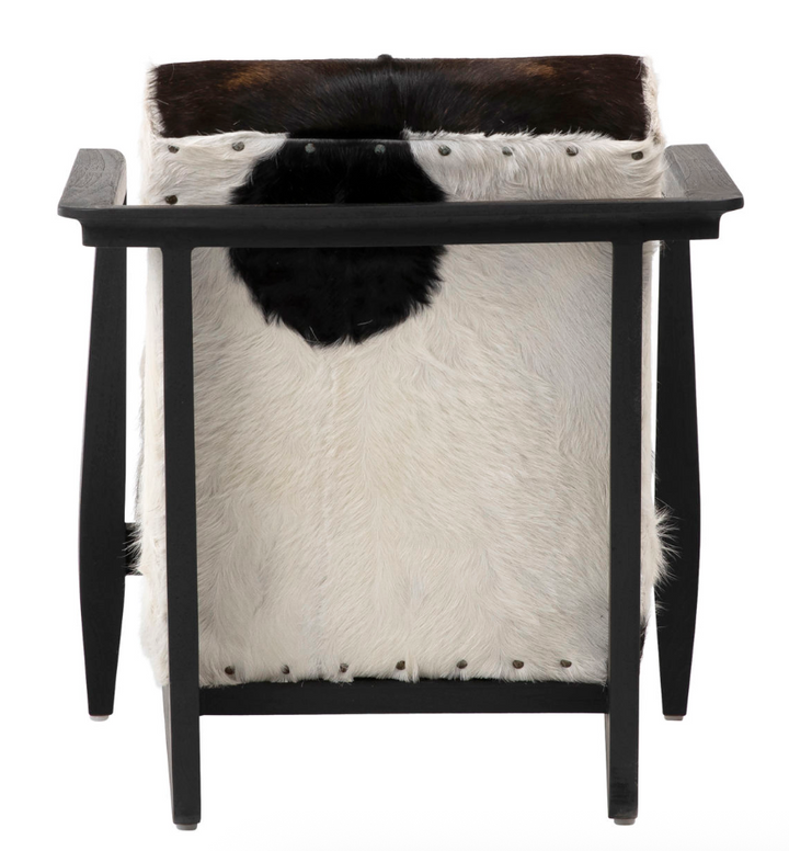 Meticulously crafted from smooth teak wood with a black finish, this occasional chair features a captivating black and white goat hide, creating a cozy reading nook or lounging area for any room in your home.