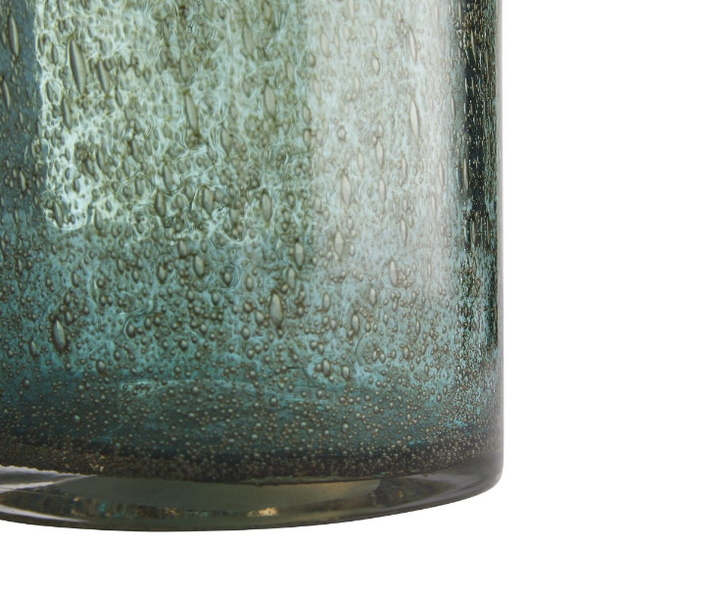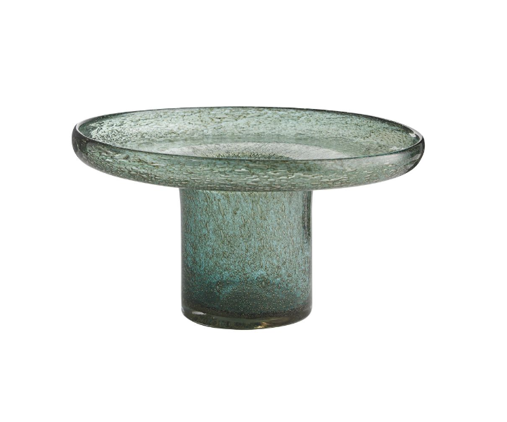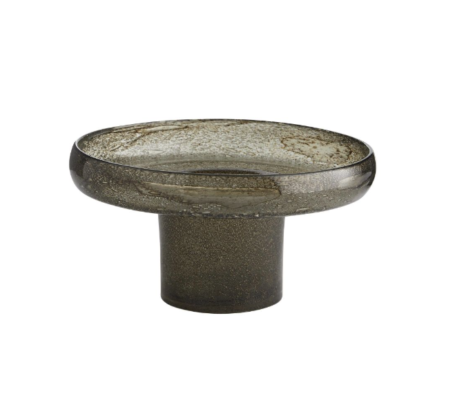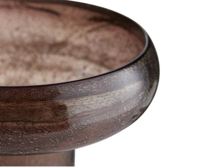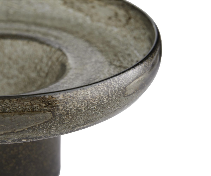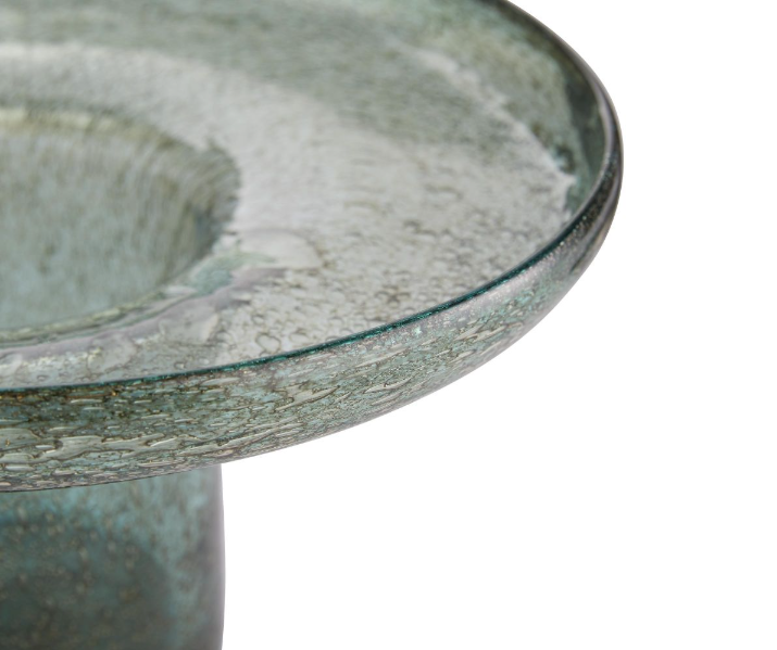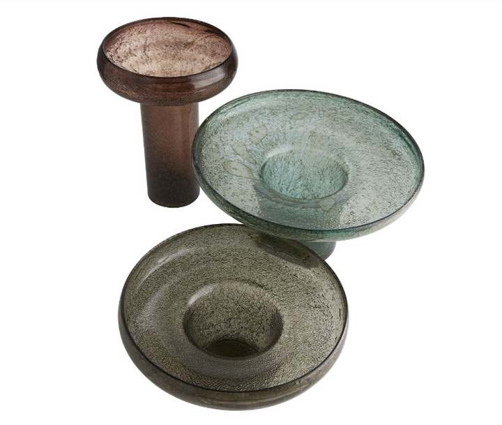 Three organic shapes come together in this set of stately mavens. Each is crafted in seeded glass, full of texture and movement, with dark smoke, rose smoke and teal smoke tones that recall jeweled treasures. Their magnificent height and scale give them presence in an awe-inspiring way. The stem bases are hollow and open, allowing them to double as vases for a centerpiece spread. finish will vary.