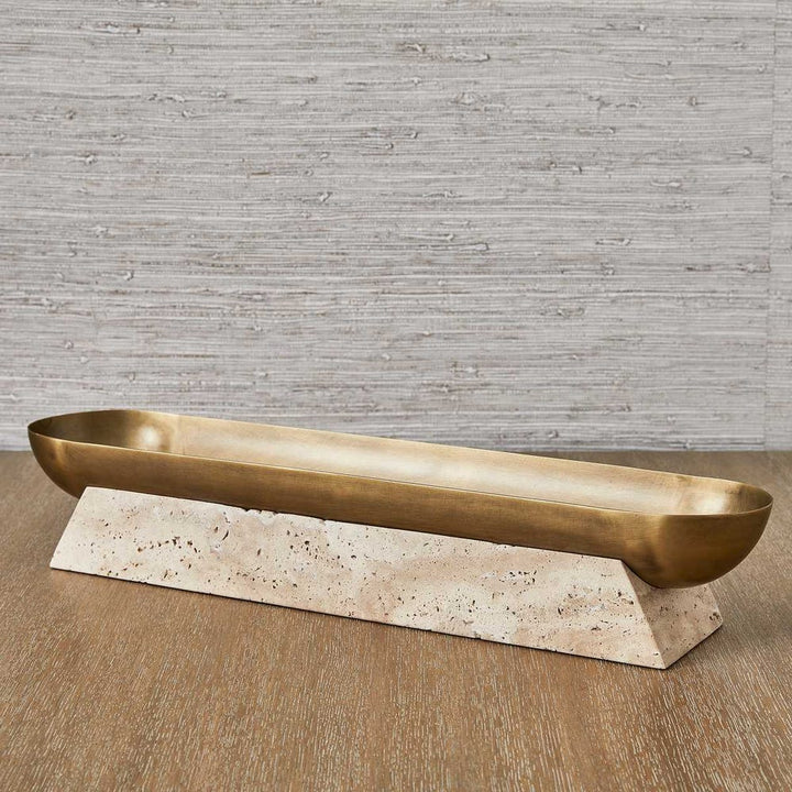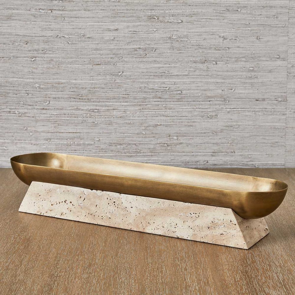 The luster of a smooth metal bowl, highlighted by its light antique brass finish, creates the perfect counterpoint to a textured pedestal carved from beige unfilled travertine. This decorative bowl holds so much potential, as a dramatic statement centerpiece or the most artful catchall ever. If using with plants that require water, a liner is recommended.