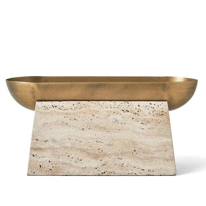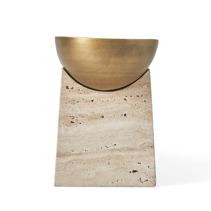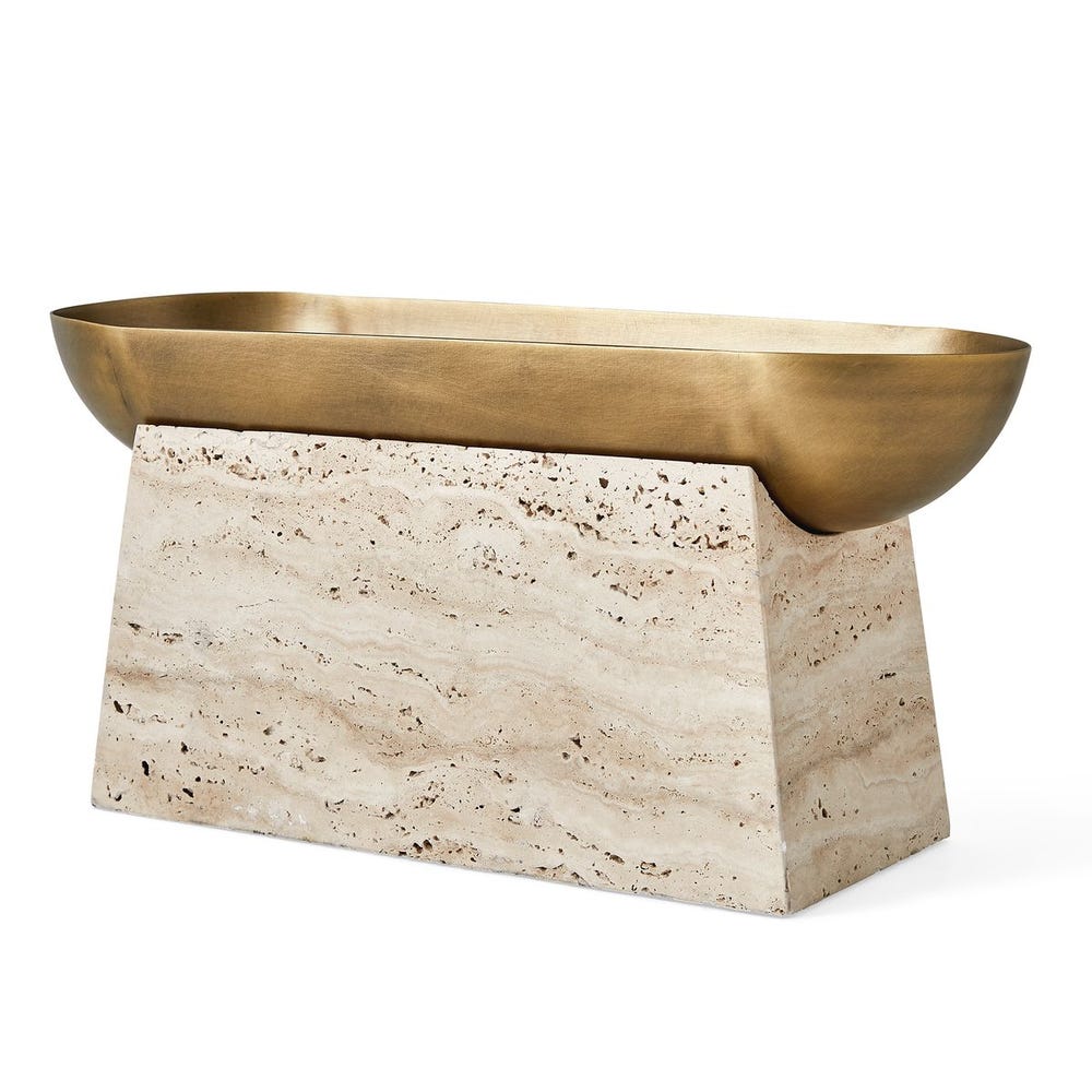 The luster of a smooth metal bowl, highlighted by its light antique brass finish, creates the perfect counterpoint to a textured pedestal carved from beige unfilled travertine. This decorative bowl holds so much potential, as a dramatic statement centerpiece or the most artful catchall ever. If using with plants that require water, a liner is recommended.