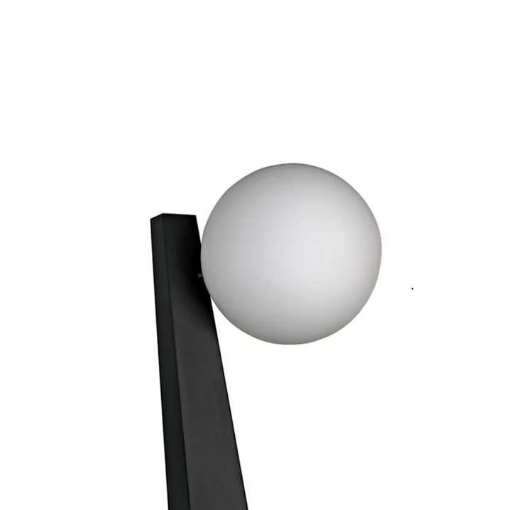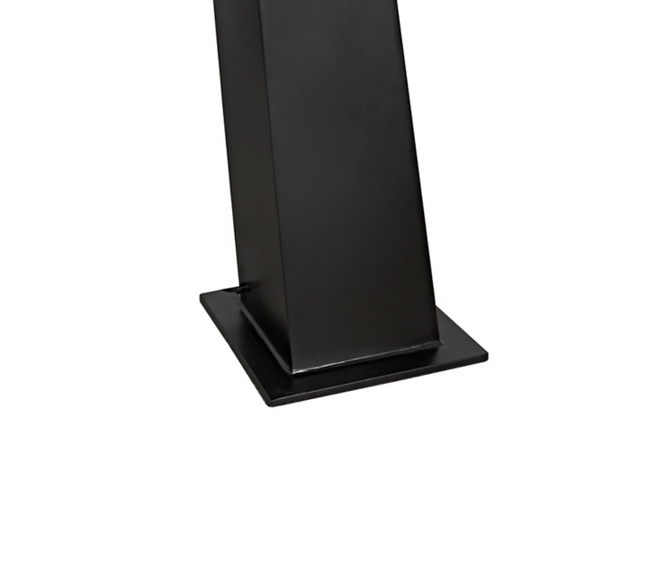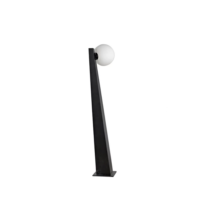 At 71″ in height, the Roy Floor Lamp in black finish iron is a statement fixture. A bold, four-sided tapering wedge shape is punctuated by a frosted ball. Plank base.