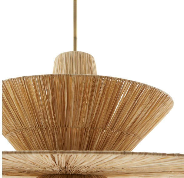 Shay chandelier exhibits a decidedly Eastern influence, specifically Japanese paper lanterns. Here, the idea is translated in natural raffia, as a dynamic tiered design. The fixture is detailed with an antique brass iron canopy and pipes. Finish will vary.