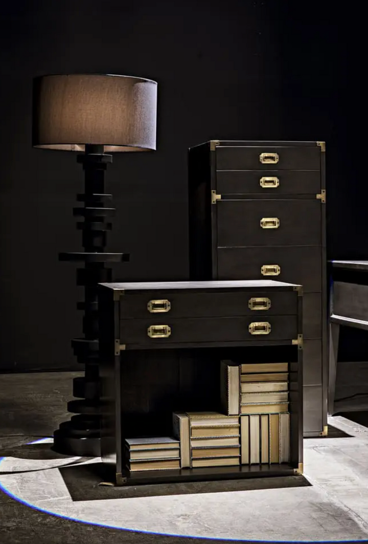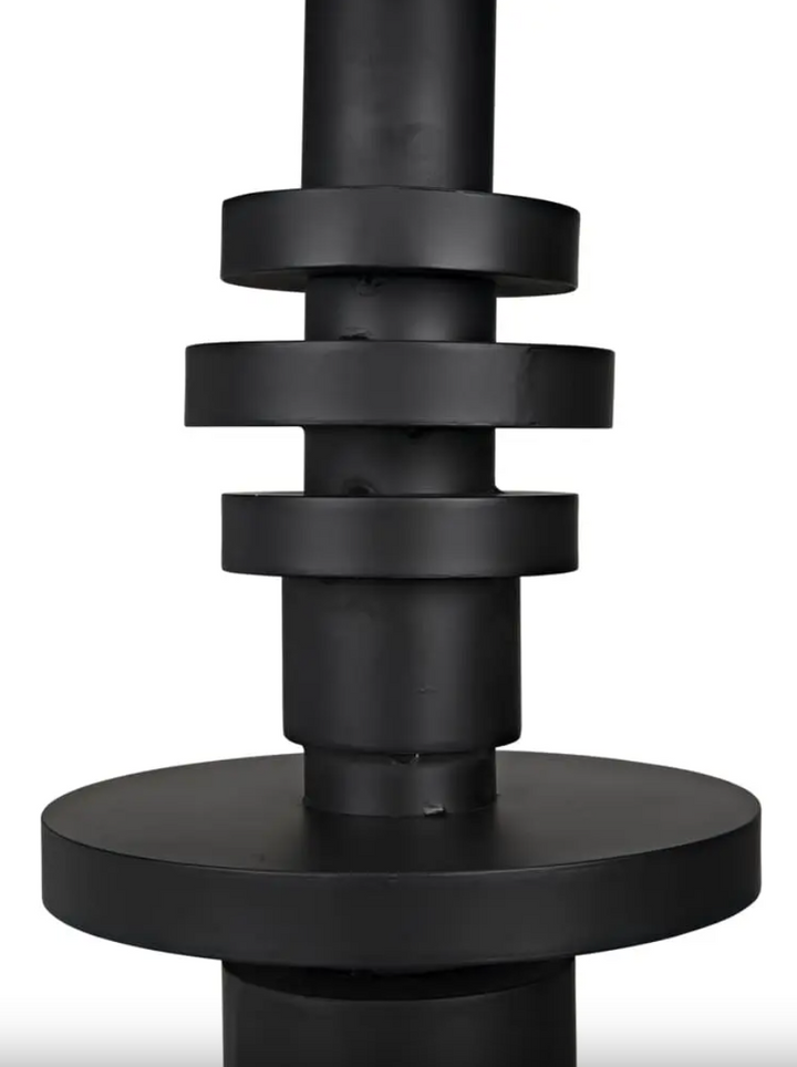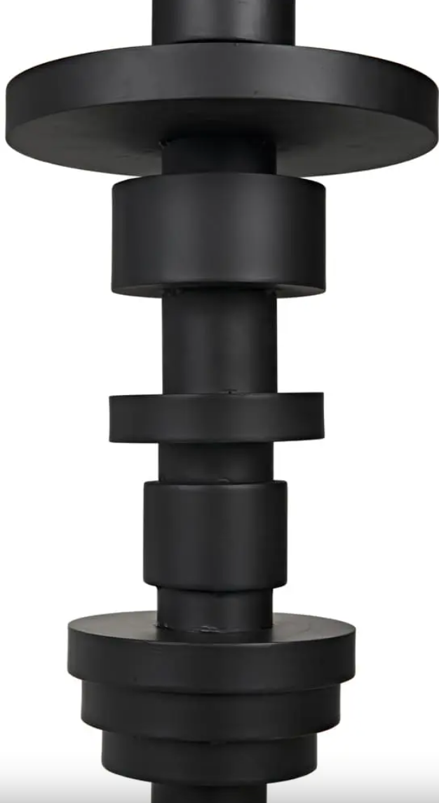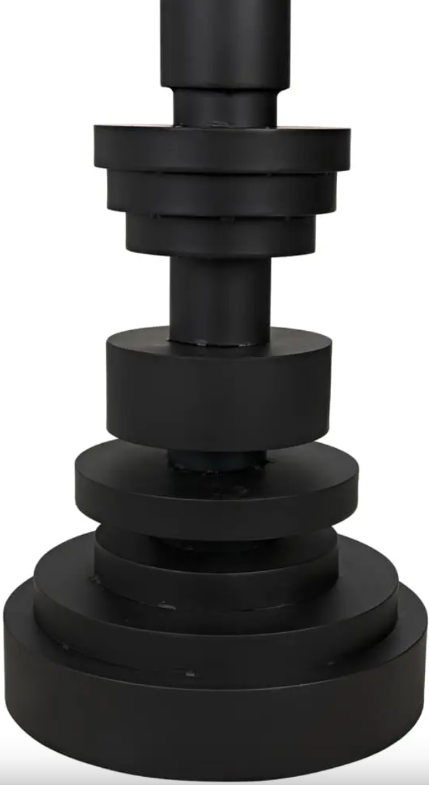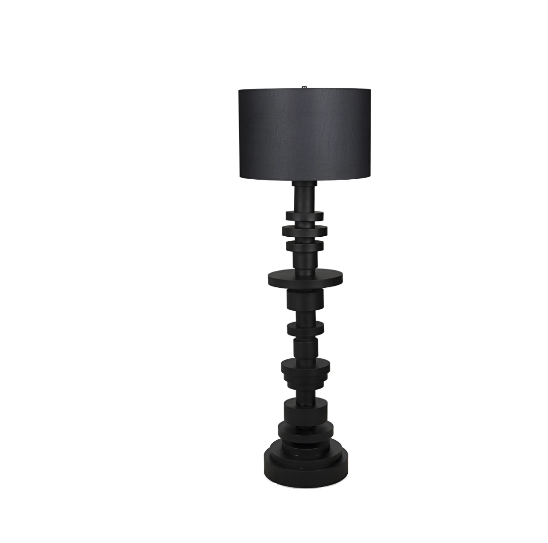 Variegated discs of metal in a rich black finish are stacked to create the bases of these extraordinary lamps. Each of the Wilton lamps includes a coordinated shade and finial, and can be easily integrated into most contemporary decors.