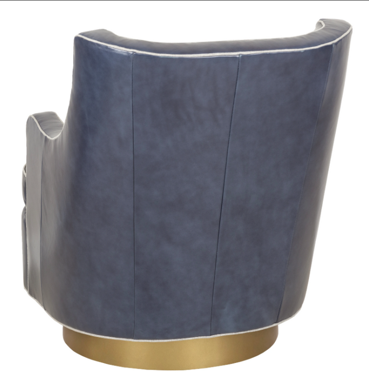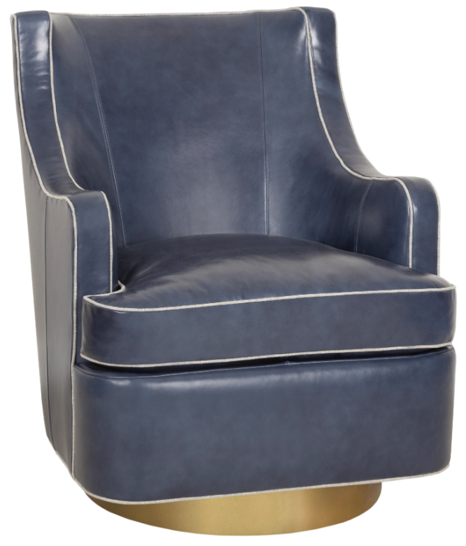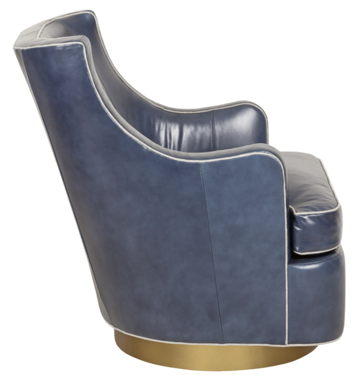 This inviting leather swivel chair has a tight back and loose seat cushion with contrasting piping detail. A perfect pair for relaxing in your favorite room, the Winston Swivel Chair combines elegance and comfort with its luxurious leather upholstery and brass metal base.